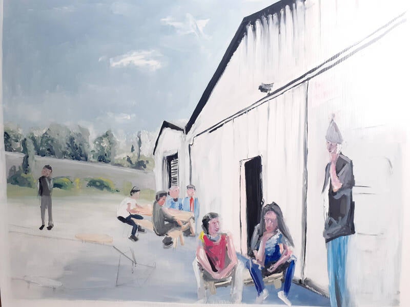9 02 026 nouveau tableau ( projection du 'jeu de ballon en bois' , espace de pause d'un atelier textile ) ... ( la projection suivante mettra en scène à travers une série de 5 tableaux les croquis 1, 2, 3, 8 et 12 de l'inventaire design de l'auteur ).